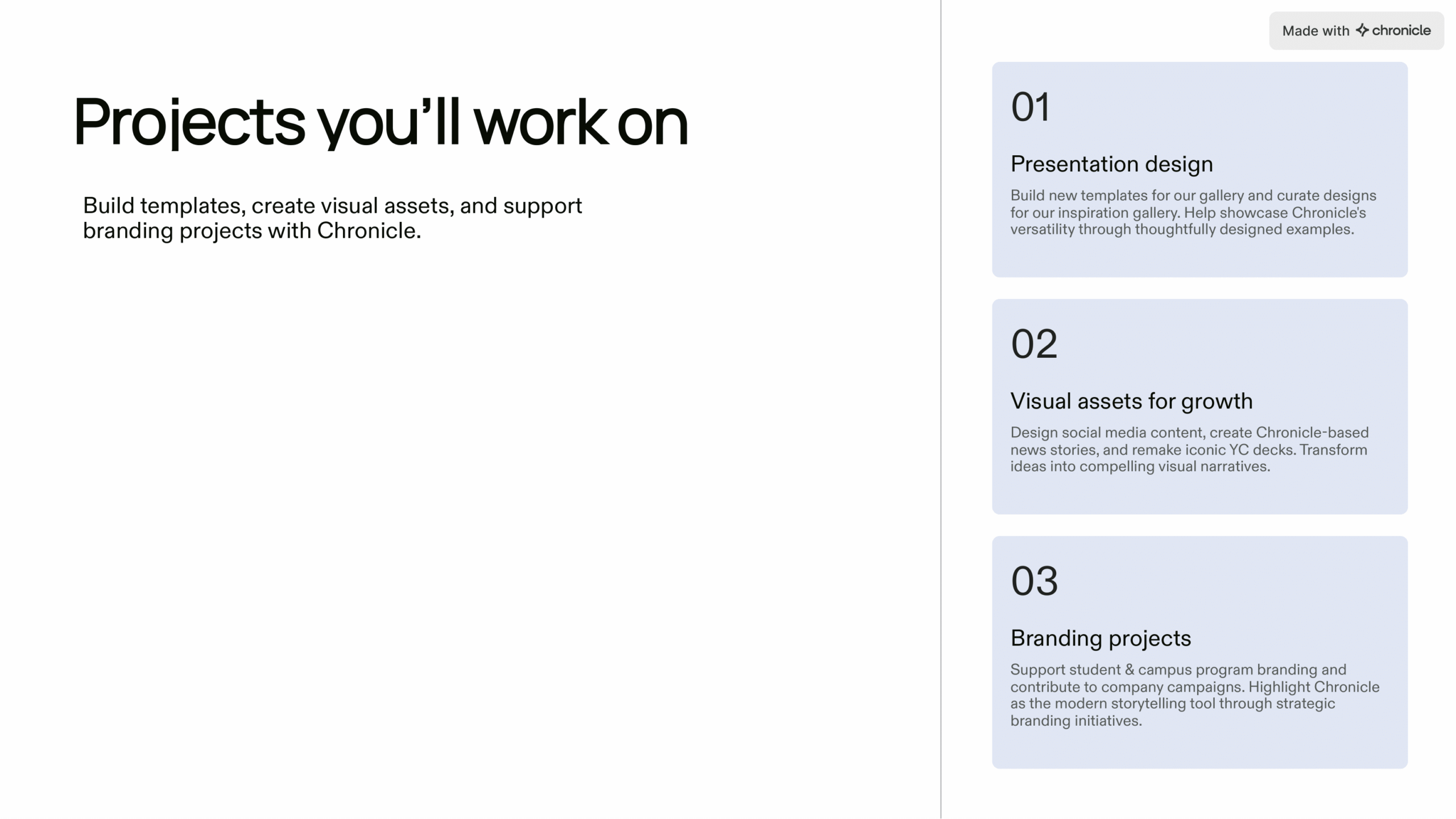 A recent job description we made when recruiting for a Design Intern at Chronicle. Present job details and responsibilities clearly with this intern job description template.