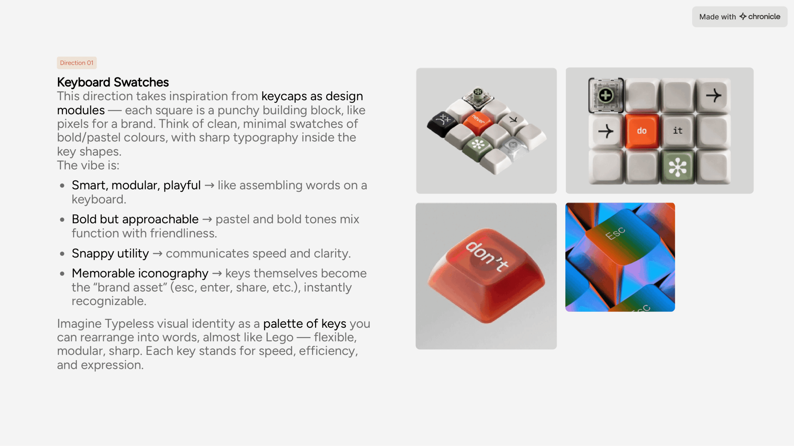 From brand strategy to campaign concepts, Chronicle makes it easy to package your creative ideas in visually striking decks. Impress clients with presentations that reflect the same polish and originality as your work.